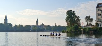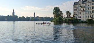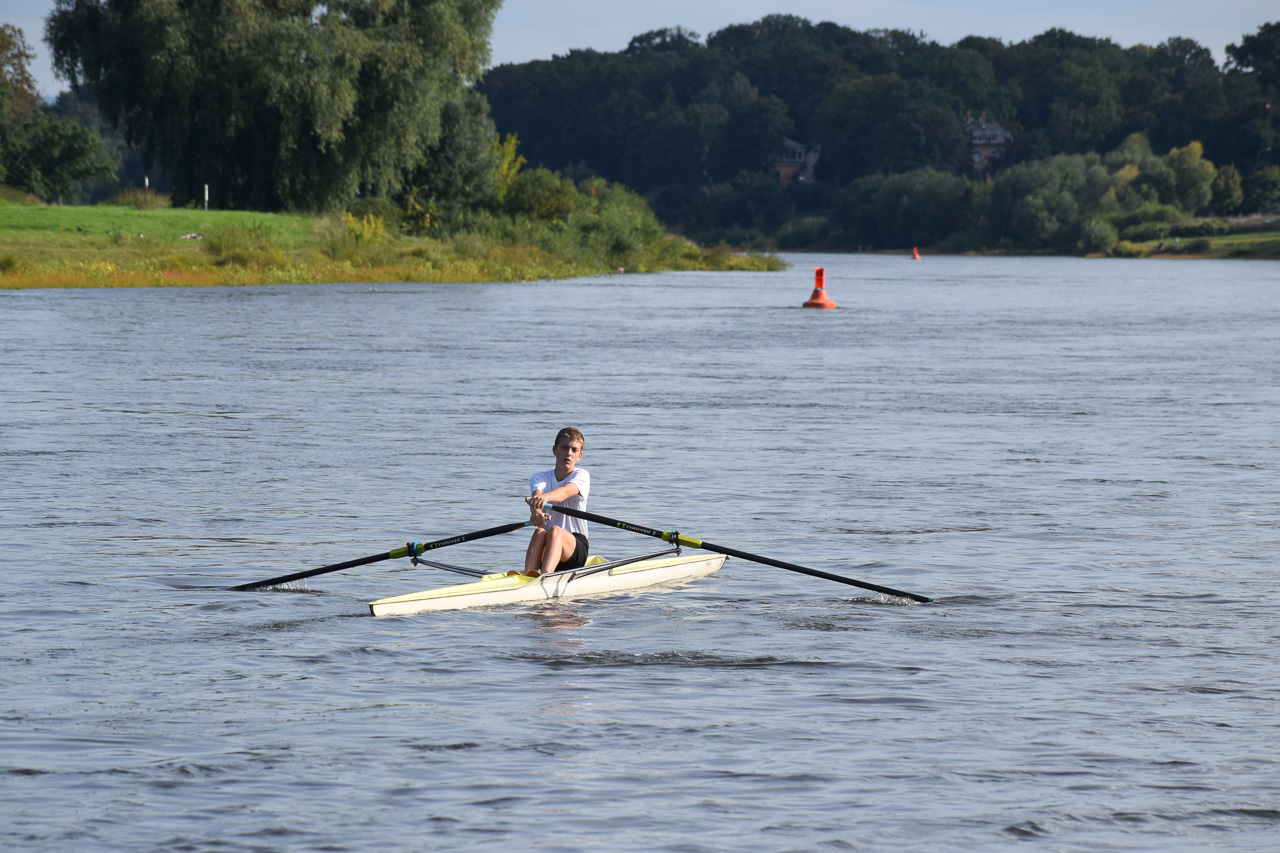 Am Freitag ging es für Tim zusammen mit dem Landesstützpunkt Dresden und dem Pirnaer Ruderverein zur Kleinbootüberprüfung (KBÜ) der Junioren B nach Brandenburg an den Beetzsee. Dort begannen sie mit einem kleinen Training, um mit der Strecke vertraut zu werden. Die Bedingungen waren überraschend gut, 22 Grad, Sonnenschein und spiegelglattes Wasser - ein echtes Highlight. Denn wer schon einmal am Beetzsee war, weiß, dass die Bedingungen hier meist sehr anspruchsvoll sind. Wind und Welle gehören hier zur Tagesordnung.