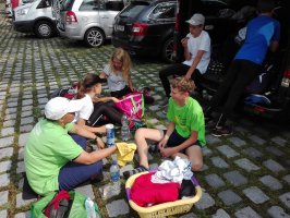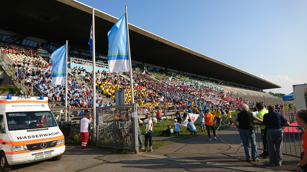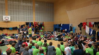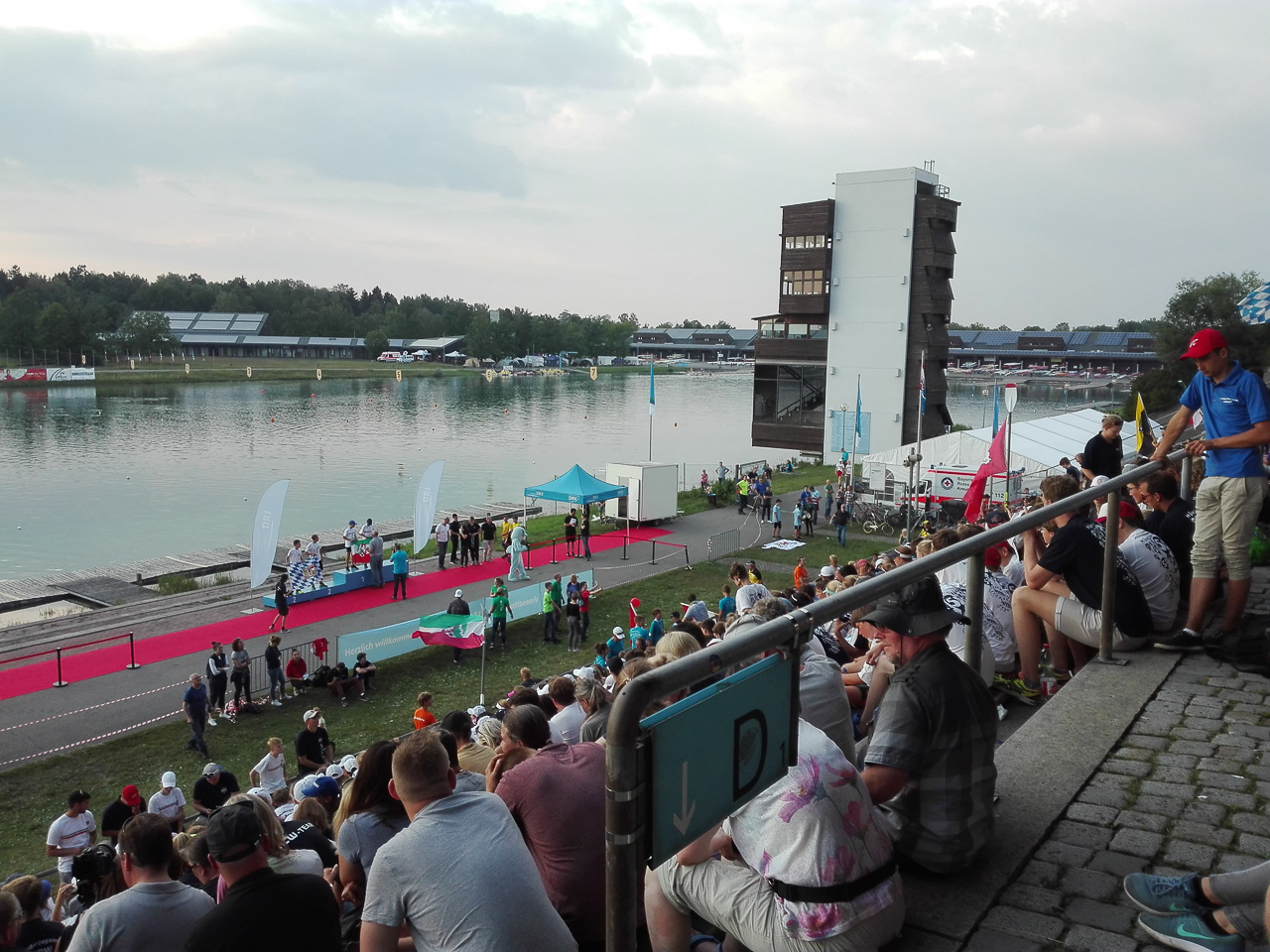Heute sind wir, Frau Haaser, Herr Haaser, Lukas, Oliver, David, Leni und Anna, um 8 Uhr am alten Bootshaus losgefahren nach München. Nach mehreren Stunden Fahrt und mit einer kleinen Pause sind wir in München an der Olympia-Regatta-Strecke von 1972 angekommen. Leider regnete es, als wir angekommen sind. Doch da wir unsere Boote beim DRC und DRV aufgeladen hatten, die noch nicht da waren, konnten wir uns schon mal umschauen. Als die Bootshänger da waren, luden wir sie ab und bauten unsere Boote an. Danach zogen wir uns noch schnell um, um noch einmal auf das Wasser zu gehen, um die Regattastrecke für die Langstrecke am nächsten Tag zu testen. Es ließ sich trotz des Regens wirklich sehr toll rudern. Nachdem wir nach einer Runde (4 km) angelegt und unsere Boote fest gemacht hatten, gingen wir uns duschen, um danach uns wiegen zu gehen. Nach dem Wiegen fuhren wir mit dem Bus zur Turnhalle, wo auch Brandenburg untergebracht war. Dort angekommen packten wir unsere Isomatten und Schlafsäcke aus. Um neun war dann Versammlung und wir erhielten Pfeifen aus Holz, die uns Glück bringen sollten. Um zehn war Nachtruhe. Leider ließen sie eine Lampenreihe an, die natürlich über uns bzw. der Hälfte von Team Sachsen war. Es war natürlich durch das Licht sehr unruhig, sodass man schlecht einschlafen konnte. Letztendlich haben wir es doch geschafft und uns sehr auf den nächsten Tag gefreut.