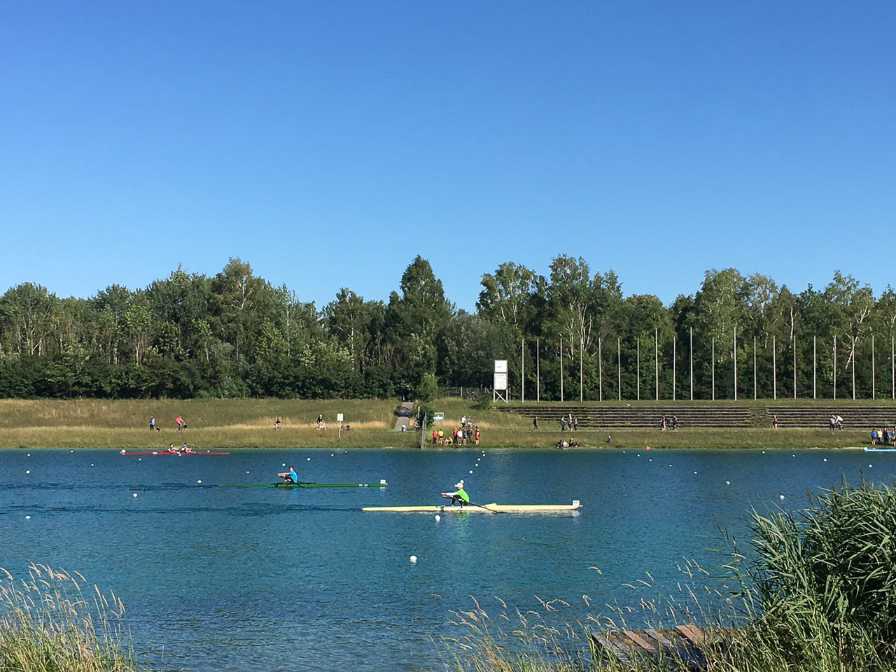 Heute war die Langstrecke über 3000 m, die entscheiden sollte, in welches Finale wir kommen. Wir sind um 8 Uhr aufgestanden. Doch da schon um 5 Uhr bei den anderen Vereinen die Wecker geklingelt haben, waren wir eh schon wach, doch sind noch liegen geblieben. Als wir dann aufgestanden sind und uns fertig gemacht haben, sind wir mit dem Bus zur Regattastrecke gefahren. Dort haben wir erst einmal gefrühstückt. Es gab jeden Tag Frühstück, Mittag und Abendbrot, das man mit einem kleinen Papierkärtchen abholen konnte. Das Frühstück war immer gleich, ein Brötchen, ein Getränk und etwas zum Belegen des Brötchens. Als alle mit dem Frühstück fertig waren, verteilten wir uns und guckten uns ein wenig bei den aufgebauten Ständen um. Nach ungefähr einer halben Stunde trafen wir uns alle fünf mit Andrea, um uns die Strecke anzuschauen und zu gucken, wo und wie wir langfahren und die Wende machen mussten. Leni und Anna mussten sich auf dem Rückweg jedoch beeilen, da sie sich langsam erwärmen mussten und noch Wettkampfkleidung anziehen mussten. Sie rannten 3 km und machten währenddessen Lauf-ABC und ein paar andere Übungen. Als sie wieder da waren, machten sie ihr Boot fertig. Da sie noch 10 Minuten Zeit hatten, gab ihnen Lukas noch ein paar Übungen. Dann ging es für die beiden aufs Wasser. Die Langstrecke verlief sehr gut für die beiden, doch war es trotzdem sehr anstrengend. Nach Leni und Anna waren dann David und Oli mit ihrem Rennen dran. Als sie es auch gut gemeistert haben, ist Lukas im Einer über die 3000 m gefahren. Nach den Rennen waren alle erst mal geschafft und alle haben sich schon sehr doll auf die Siegerehrung gefreut. Doch bevor sich alle Bundesländer auf den Tribünen versammelten, gab es erst einmal Abendbrot. Als die Siegerehrung begann, waren alle sehr aufgeregt. Unser Verein hatte danach insgesamt 2 Gold- und 3 Silbermedaillen geholt. Nach diesem doch unerwarteten Erfolg waren alle sehr stolz aufeinander und wir freuten uns schon auf den nächsten Tag, weil da der allgemeine Sportwettkampf dran war.