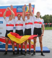 Der Männer-Doppelvierer mit Schlagmann Philipp Wende (Wurzener RV "Schwarz Gelb", rechts), unserem Laubegaster Kai Fuhrmann (2.v.r.), Tim Grohmann (Dresdner RC 1902, 2.v.l.) und Karl Schulze (USV TU Dresden, links) holten unter schwierigen Bedingungen in einem spannenden Rennen die Bronze-Medaille hinter den Booten aus der Ukraine und Großbritannien und konnten sich gegen China, Estland und die Schweiz durchsetzen.